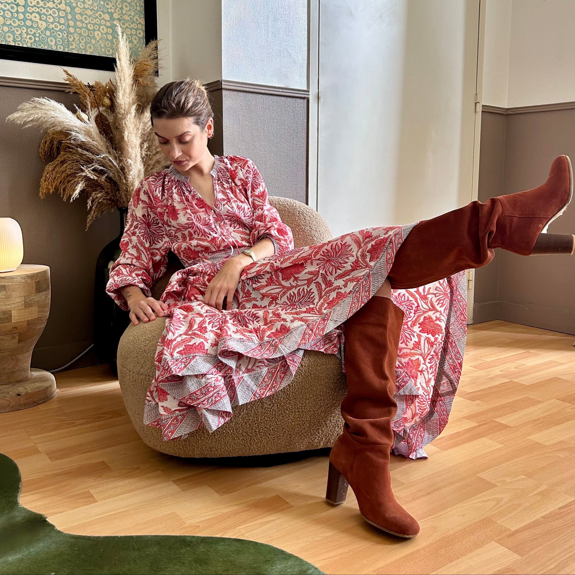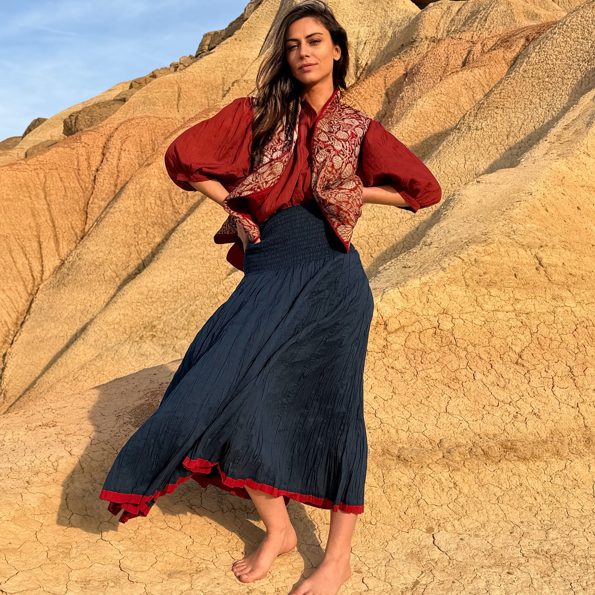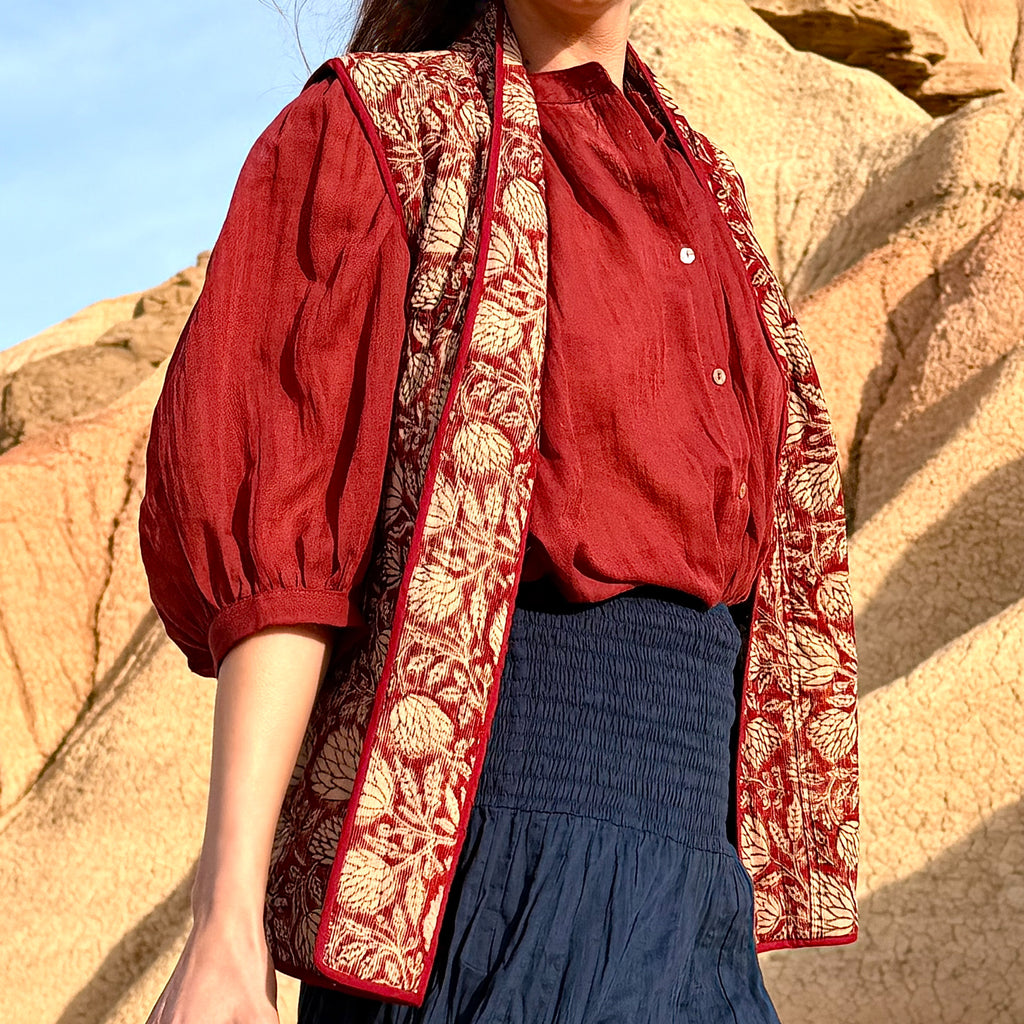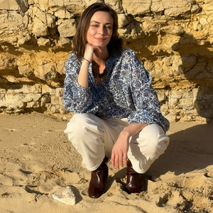 Celui d’une femme curieuse et passionnée, guidée par le désir de donner du sens à la beauté. Fondée par Louise, Lûza puise son inspiration dans les paysages vibrants, les traditions et la richesse des cultures du monde. C’est au cœur du Rajasthan, en Inde, que la marque a vu le jour. Lors d’un voyage initiatique à Jaipur, la “ville rose”, Louise découvre un univers où chaque couleur, chaque geste, chaque motif semble raconter une histoire. De ses visites dans les musées dédiés aux arts textiles, aux galeries photographiques retraçant la vie des artisans, jusqu’aux ateliers de blockprint où le coton se pare de pigments naturels, elle s’imprègne profondément de cet art de vivre empreint de patience, de symbolisme et d’âme. Ces rencontres, ces odeurs d’encre et de coton chaud, ces conversations autour des savoir-faire, ont façonné la vision qui donnera naissance à Lûza.