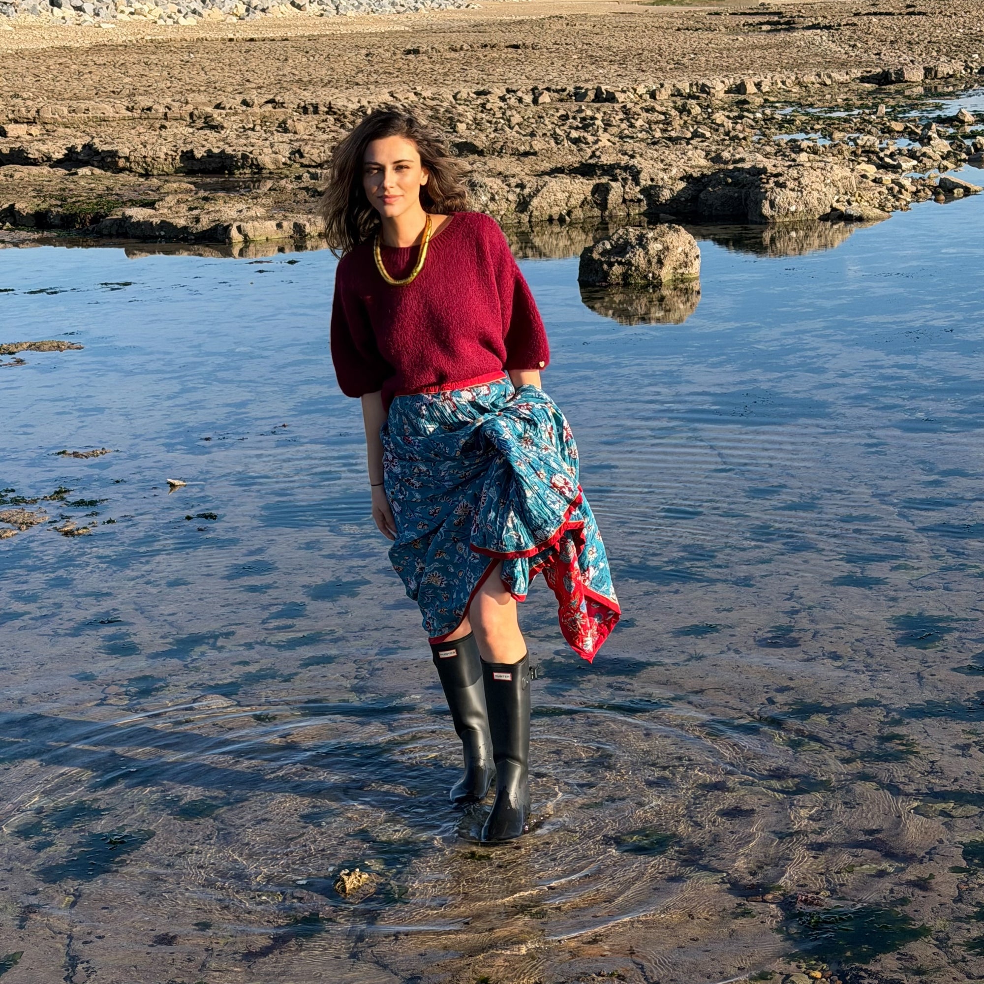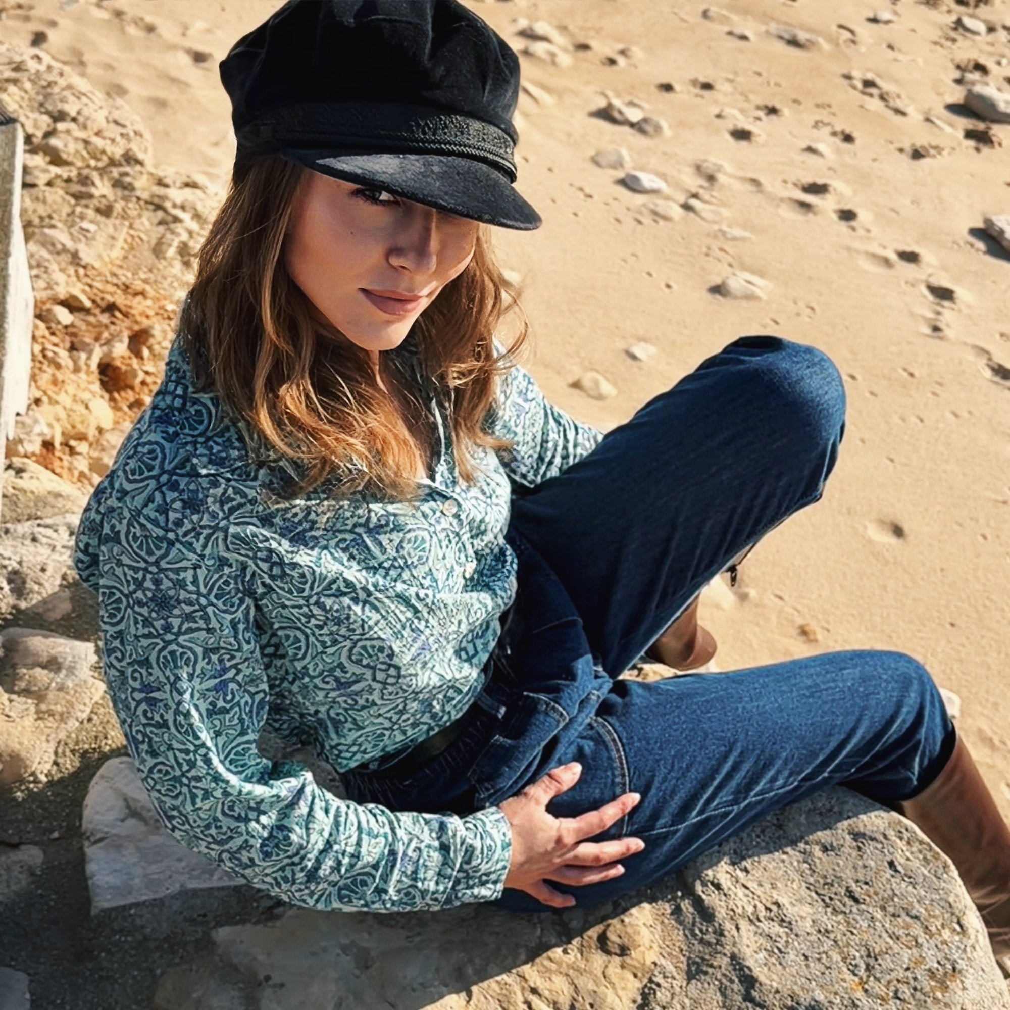 C’est dans cette atmosphère que Marina est née : une collection pensée comme une escale entre élégance et liberté. Les jupes plissées se déploient comme des voiles au vent, jouant avec les camaïeux de bleus marins. Les blouses imprimées rappellent les herbiers marins et les paysages méditerranéens, tandis que les rayures graphiques des chemises réinventent les codes navy avec modernité. Le rouge amiral et l’orangé solaire ponctuent cette harmonie, tels des fanions colorés flottant au-dessus d’un port. Chaque pièce est façonnée en coton de qualité, léger et précieux, conçu pour voyager avec vous — de la promenade sur les quais au dîner élégant, de la plage au coucher de soleil. Marina, c’est un horizon qui se porte.