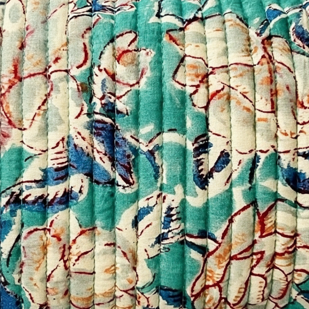 Le motif Sagar mêle un vert d’eau lumineux à des fleurs aux contours rouge et indigo, imprimées à la main. Un design frais et vibrant, qui évoque la douceur des jardins au bord de l’océan indien.
