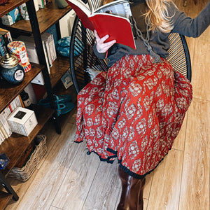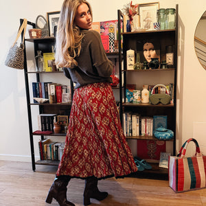 Son imprimé Lalima, réalisé à la main selon la technique ancestrale du blockprint, met en lumière un rouge profond ponctué de fleurs ivoire. Chaque motif porte l’empreinte du geste artisanal : des nuances vivantes, une vibration authentique et ce charme inimitable propre aux pièces façonnées à Jaipur.