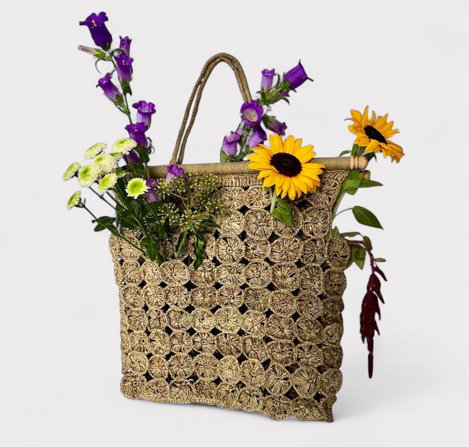 Le Cabas Ambilobe célèbre l’art du crochet traditionnel malgache à travers une création d’une rare délicatesse. Réalisé entièrement à la main en raphia 100 % naturel, il a nécessité plus de 90 heures de travail minutieux, entre points en demi-bride et dentelles florales savamment assemblées.