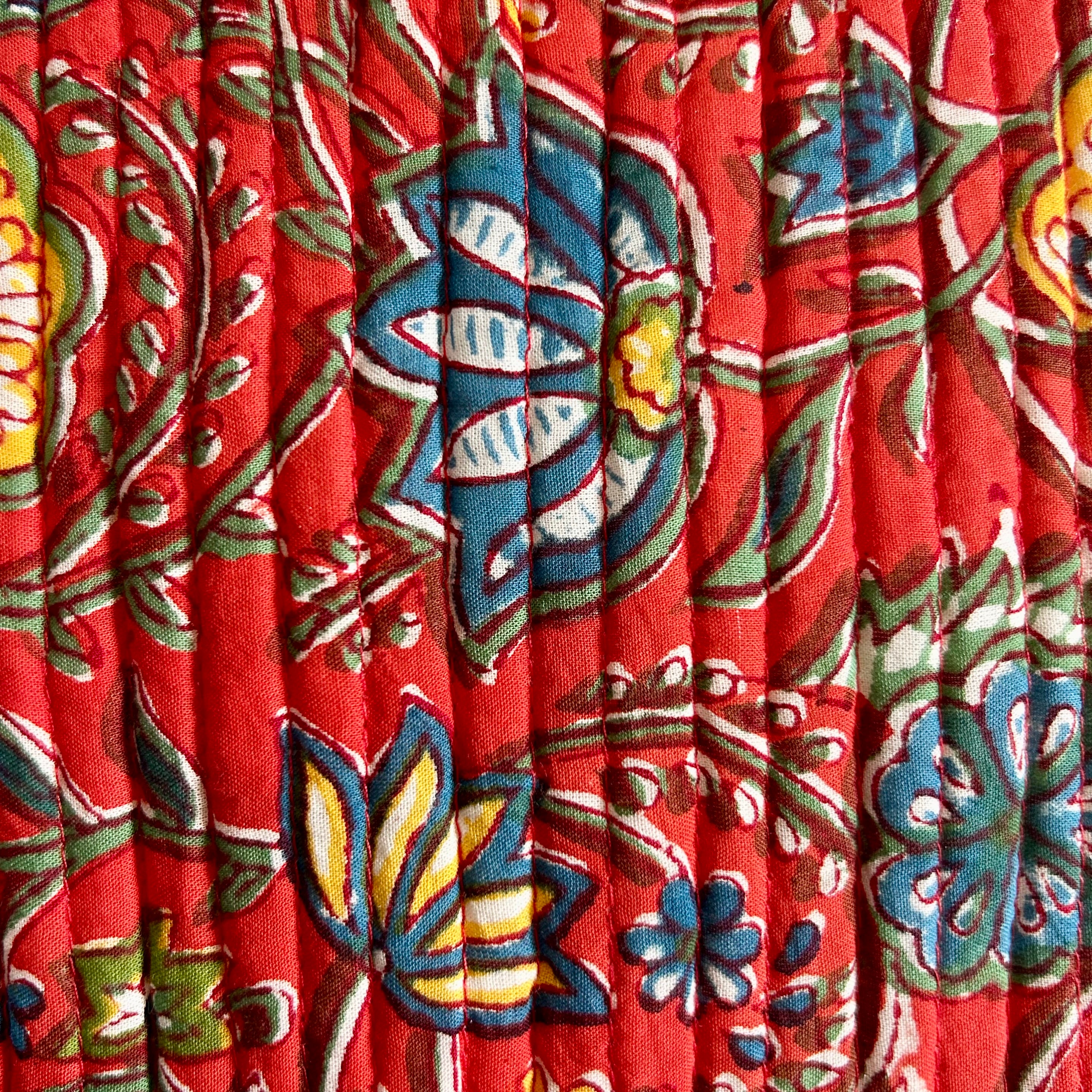 Confectionnée en 100 % voile de coton et entièrement imprimée à la main selon la technique du blockprint, elle se distingue par ses motifs lumineux et son caractère artisanal unique. Dotée d’une doublure étanche, elle vous accompagne aussi bien à la plage qu’en voyage, en protégeant vos affaires de l’eau, du sable ou du soleil.