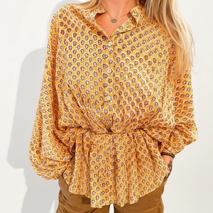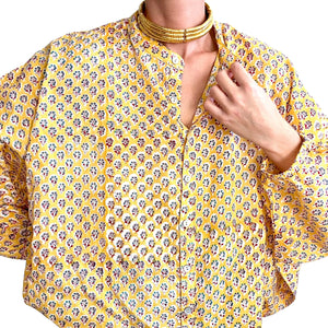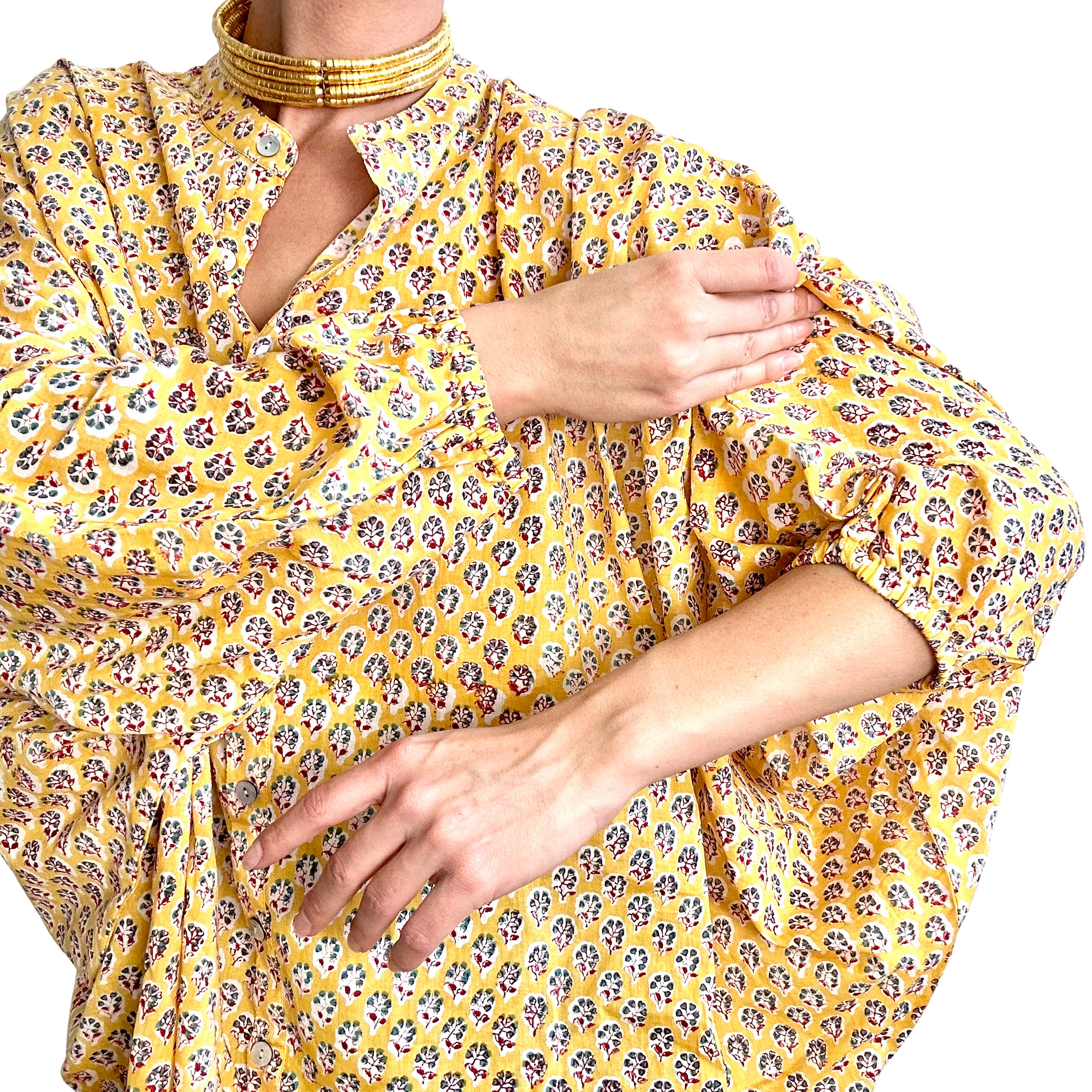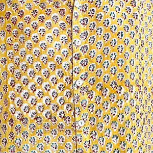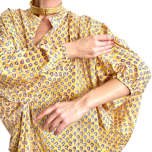 Le motif Padmini célèbre la délicatesse et la grâce des jardins indiens. Sur une base jaune lumineuse, de petites fleurs stylisées se déploient en rythme, créant un imprimé à la fois fin, joyeux et intemporel. Inspiré des ornements traditionnels du Rajasthan, Padmini mêle douceur et caractère dans une harmonie subtile. Un motif solaire qui illumine la silhouette et révèle toute la poésie artisanale de Lûza.