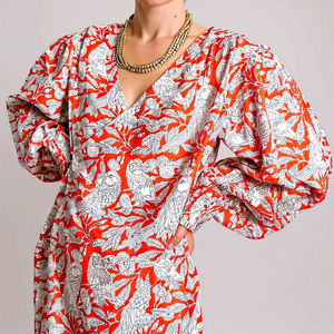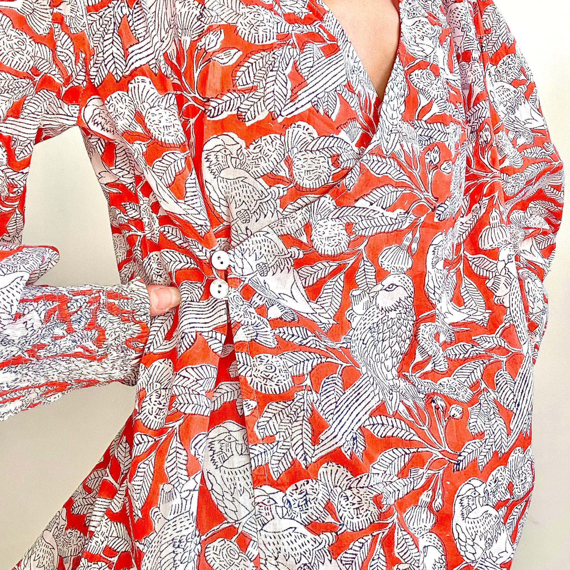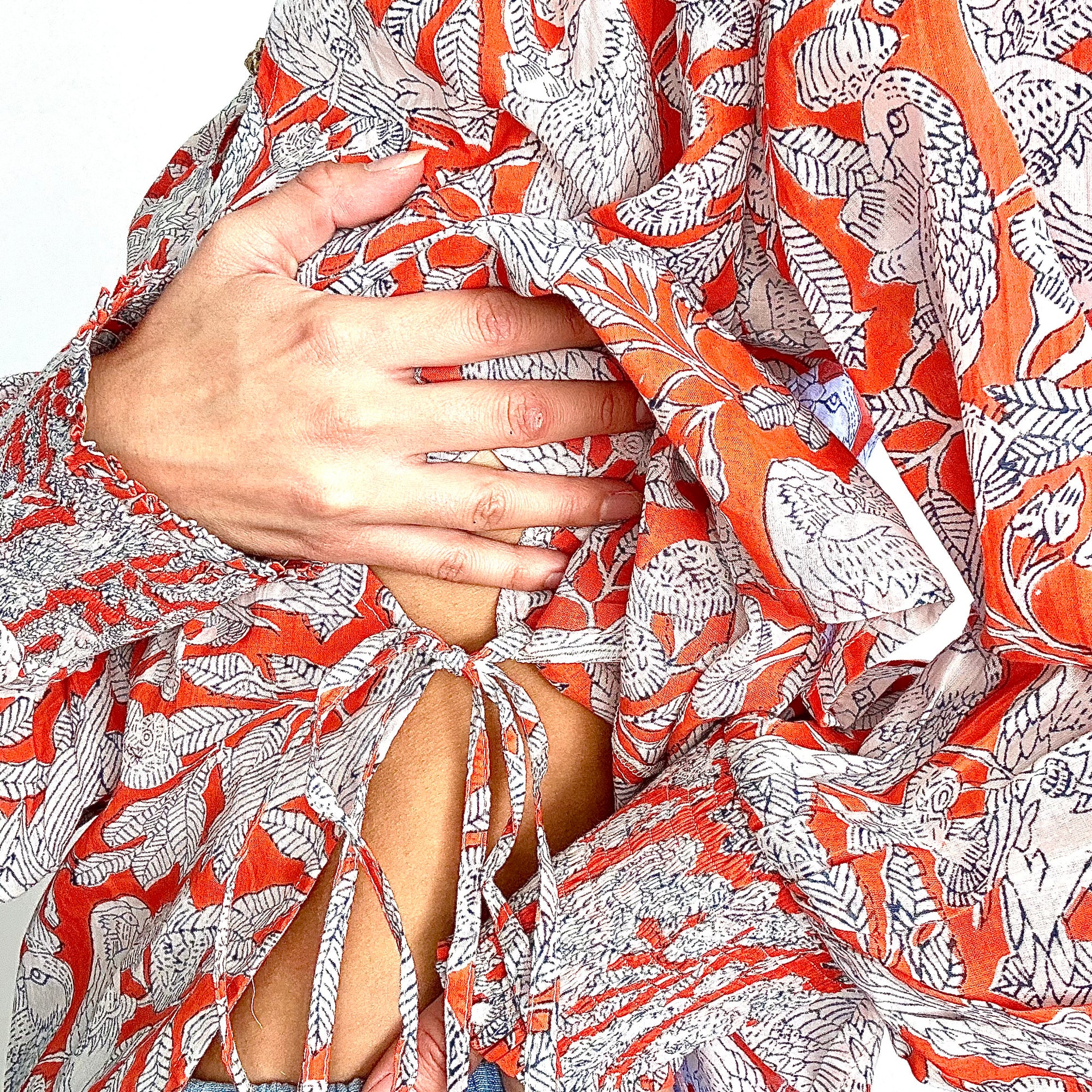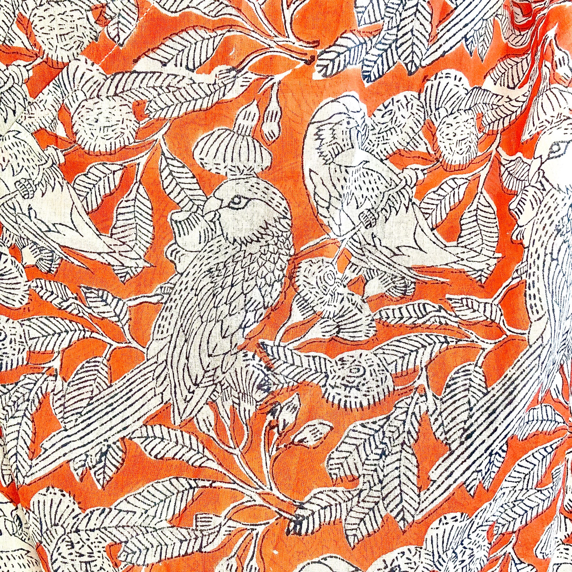Le motif Sarika mêle oiseaux gracieux et feuillages fins, dessinés à la main sur un fond orangé lumineux. Imprimé en blockprint, il révèle des lignes délicates et un contraste élégant, offrant une allure à la fois poétique et sauvage.