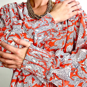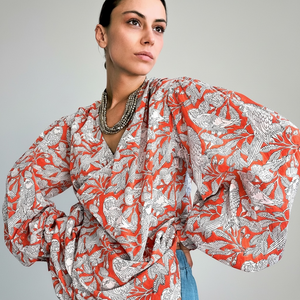 La blouse Kanpur incarne l’alliance parfaite entre audace et légèreté. Imprimée à la main à Jaipur selon la technique traditionnelle du blockprint, elle célèbre le geste ancestral des artisans indiens : chaque tampon sculpté dans le bois appose son empreinte unique, révélant un motif vivant et poétique.
