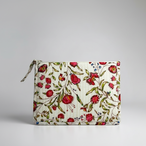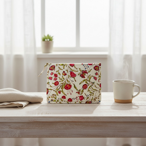 Son motif Shalimar, inspiré des jardins de Jaipur, déploie une palette de rouges profonds et de verts tendres sur un voile de coton ivoire. Le contraste entre la fraîcheur du fond et la profondeur des fleurs carmin — un souffle d’Inde à emporter partout.