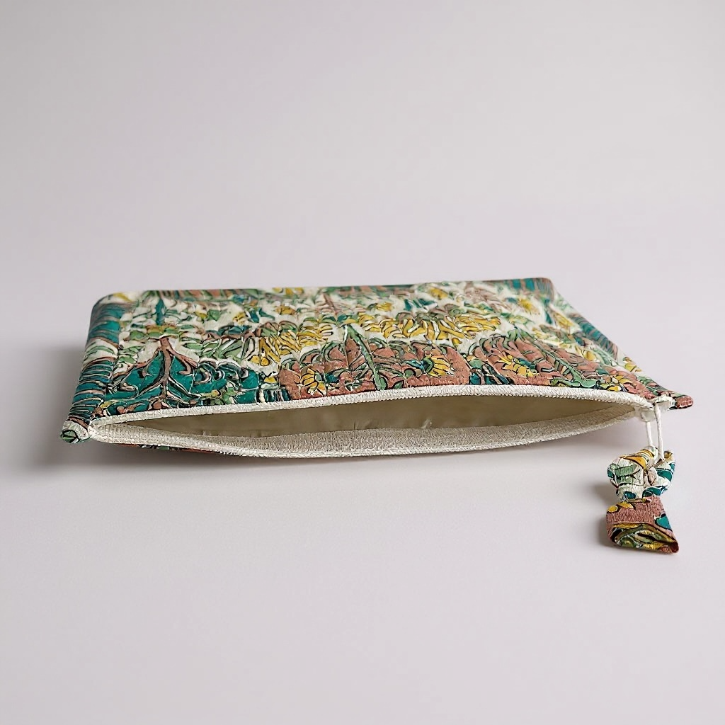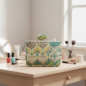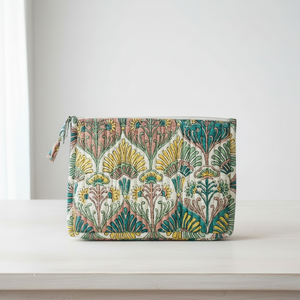 Son motif Sundar Grove s’inspire des jardins luxuriants de l’Inde ancienne. Ses éventails floraux et ses palmettes délicatement stylisées se déploient en nuances de vert, de jaune soleil et de rose terre. Un dessin harmonieux, généreux et lumineux, qui évoque la beauté végétale et la poésie des motifs artisanaux du Rajasthan.