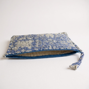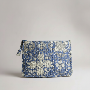 Son motif Jodhpur s’inspire des ornements floraux et architecturaux de la « ville bleue ». Sur un fond indigo doux, se déploient des fleurs stylisées et des arabesques délicates, rappelant les fresques et les portes sculptées du Rajasthan. Un imprimé riche, raffiné et profondément artisanal.