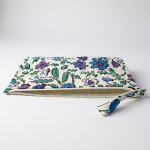 Son motif Anaya, célèbre un jardin vibrant où fleurs bleu indigo et violettes s’entrelacent à des feuillages verts délicats. Inspiré des compositions florales indiennes, il offre une esthétique fraîche, joyeuse et pleine de douceur.